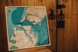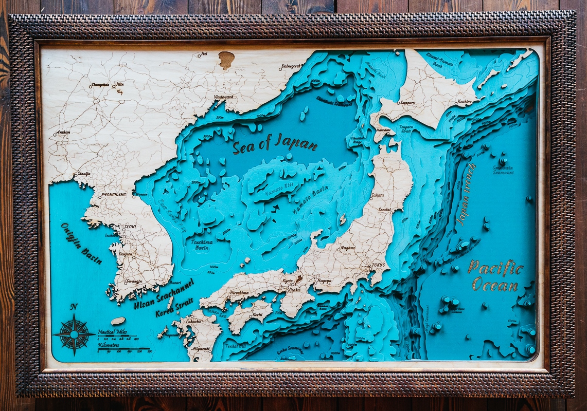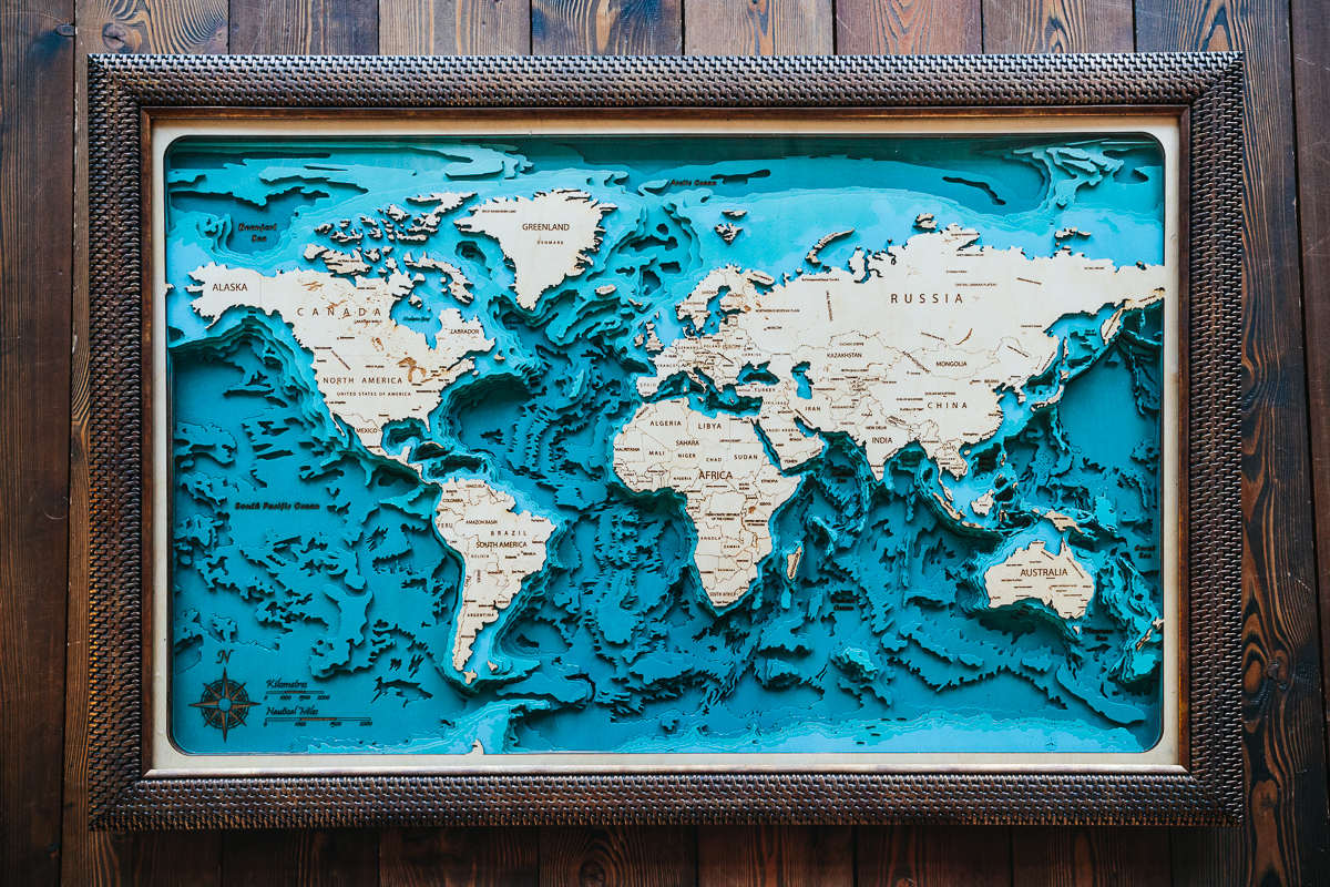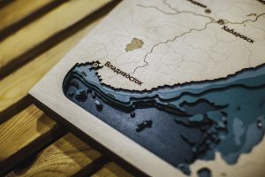 Глубины карты режутся лазером в точном соответствии с реальными глубинами акваторий, на основании данных батиметрических карт. Верхний слой карты, обозначающий земную поверхность, вырезается и гравируется лазером в точном соответствии с географическими картами, с нанесением на него рек, озер, дорог, а так же основных населенных пунктов. Каждый слой карты, обозначающий определённую глубину, выкрашивается специальными красками в свой уникальный цвет, что придаёт карте ещё более мощный визуальный эффект.