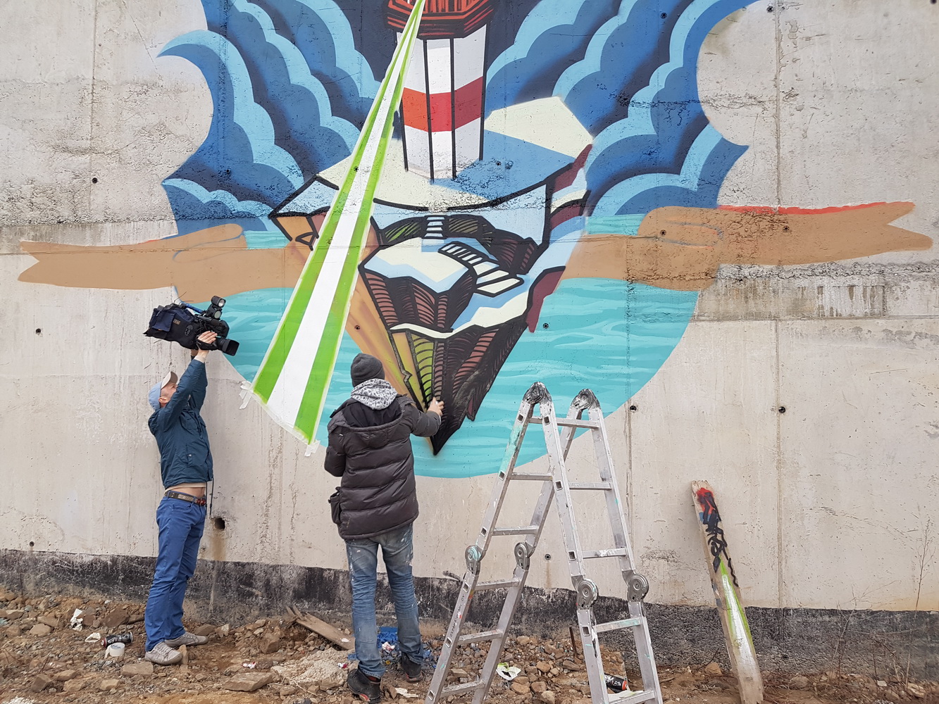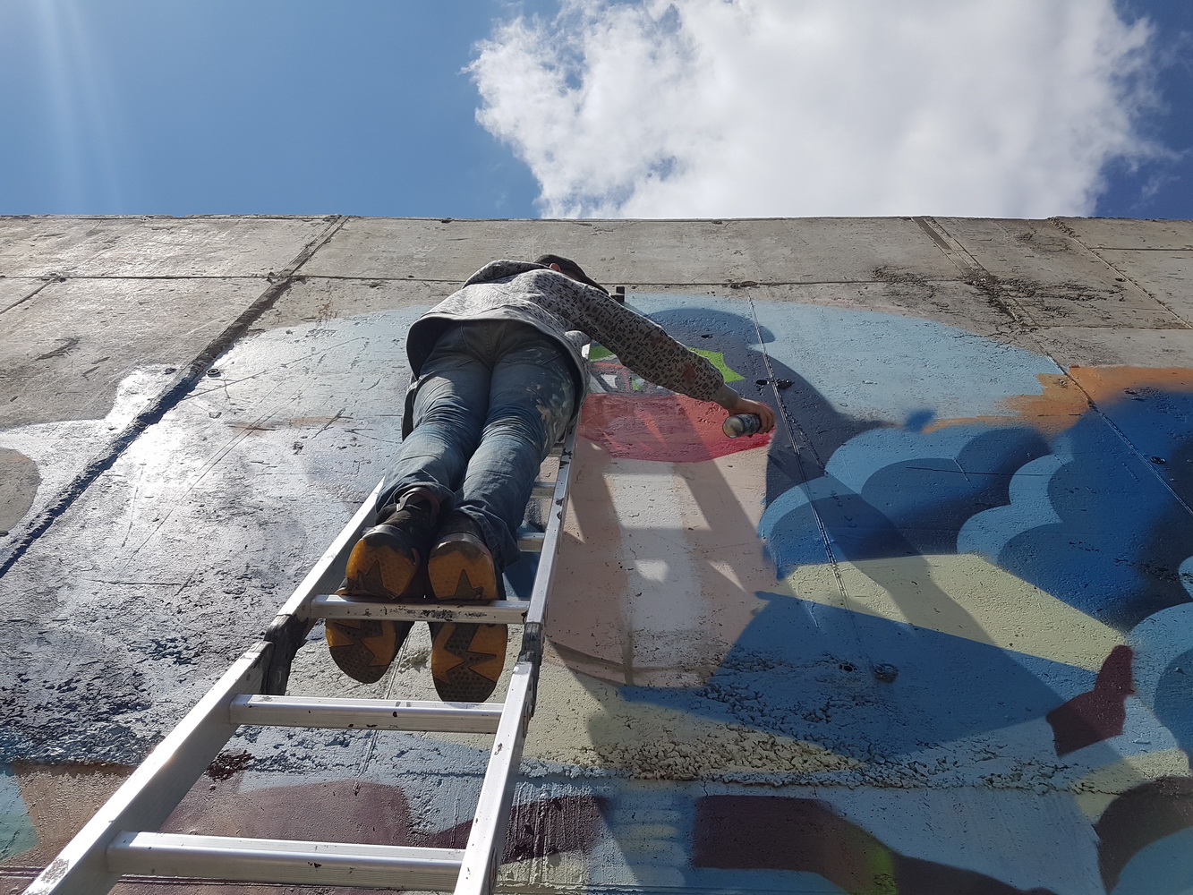 25 апреля была реализована основная часть рисунка. Мы благодарим Киноаттракцион 5D (ул. Добровольского, 5, телефон 27-76-386) за предоставленную очень длинную лестницу-стремянку!