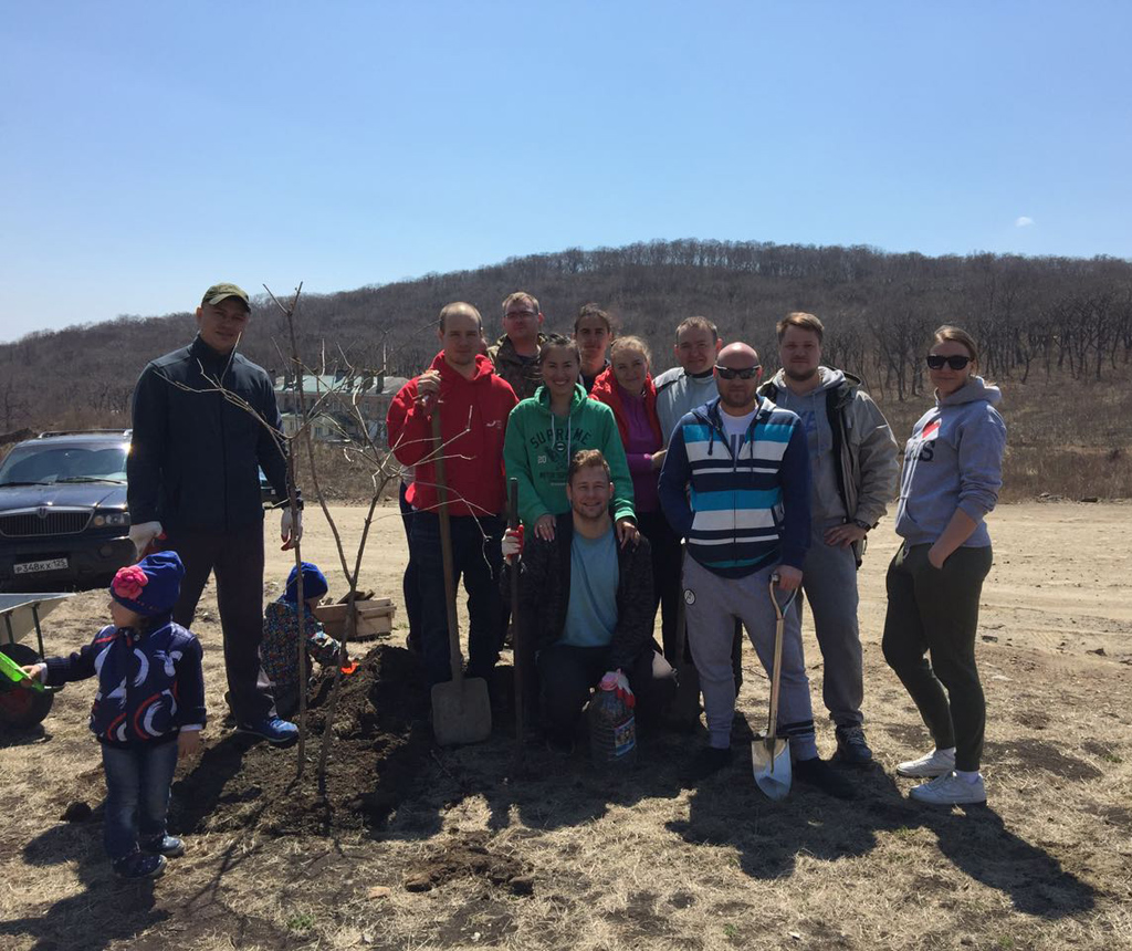 Участвовало 17 человек, включая детей. Посадили 8 деревьев приморской вишни рядом с домом, очистили косогор перед домом от мусора и, конечно же, устроили барбекю!