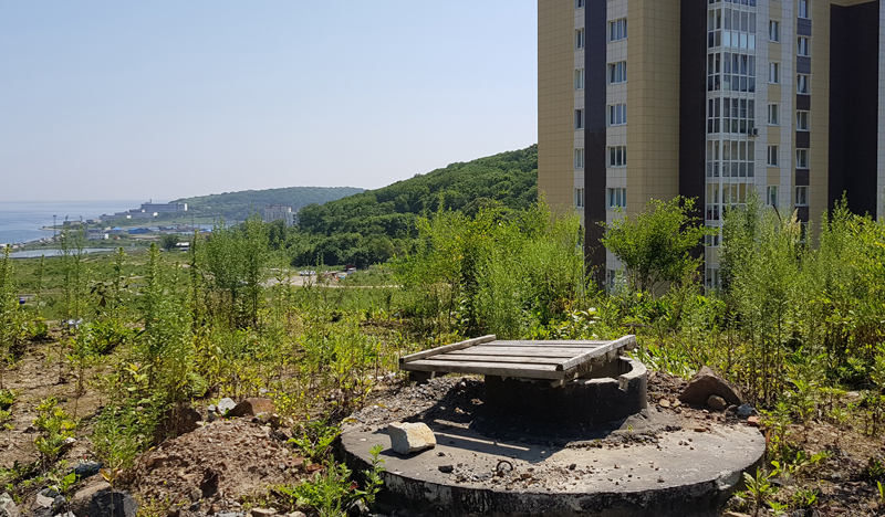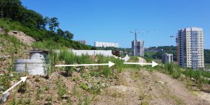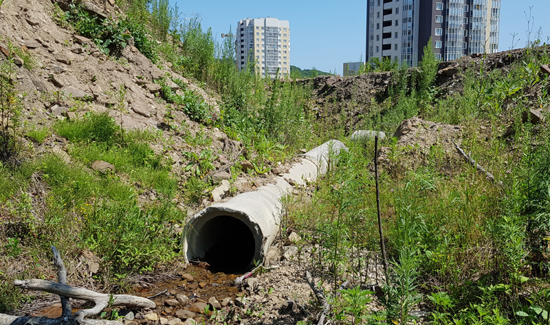 Система ливневой канализации не находится в ведении Приморского водоканала, а зона ответственности управляющей компании заканчивается придомовой территорией. Ливневка как сооружение конкретно в нашем районе является еще одним брошенным ФГУП “Дальспецстрой”, но проблемный её фрагмент скорее всего располагается на земельном участке, предназначенном для дороги, который в апреле сего года был отдан ОА “ДОМ.РФ” нашему городу. В настоящее время Администрация Владивостока еще не завершила официальную приемку этих участков на баланс.