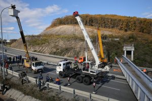 По словам специалистов, произошло самопроизвольное открытие кузова, в результате чего железобетонная балка виадука упала на проезжую часть.