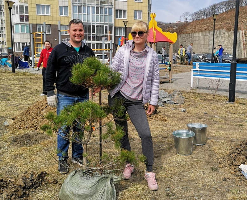 Сосны, ель, клён, абрикосы, боярышник, рододендрон, вейгела белоцветковая, карагана. Участников было много, жители приходили с детьми!