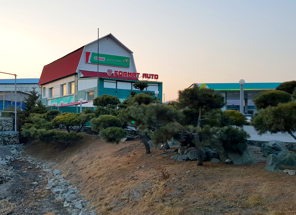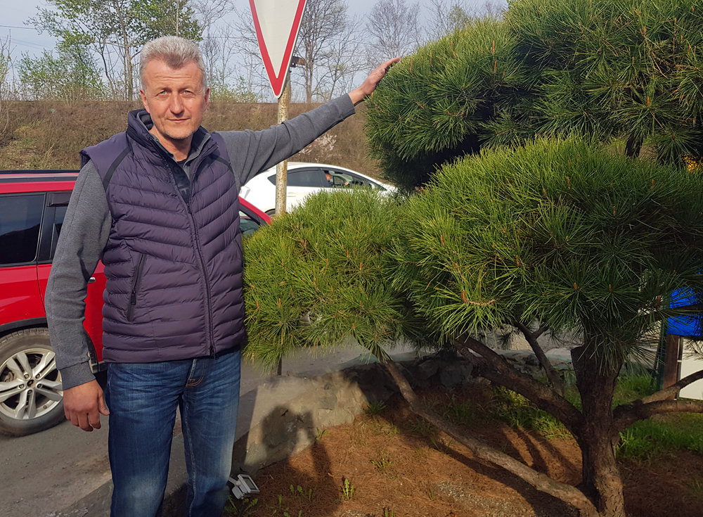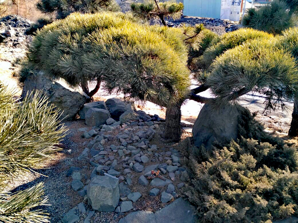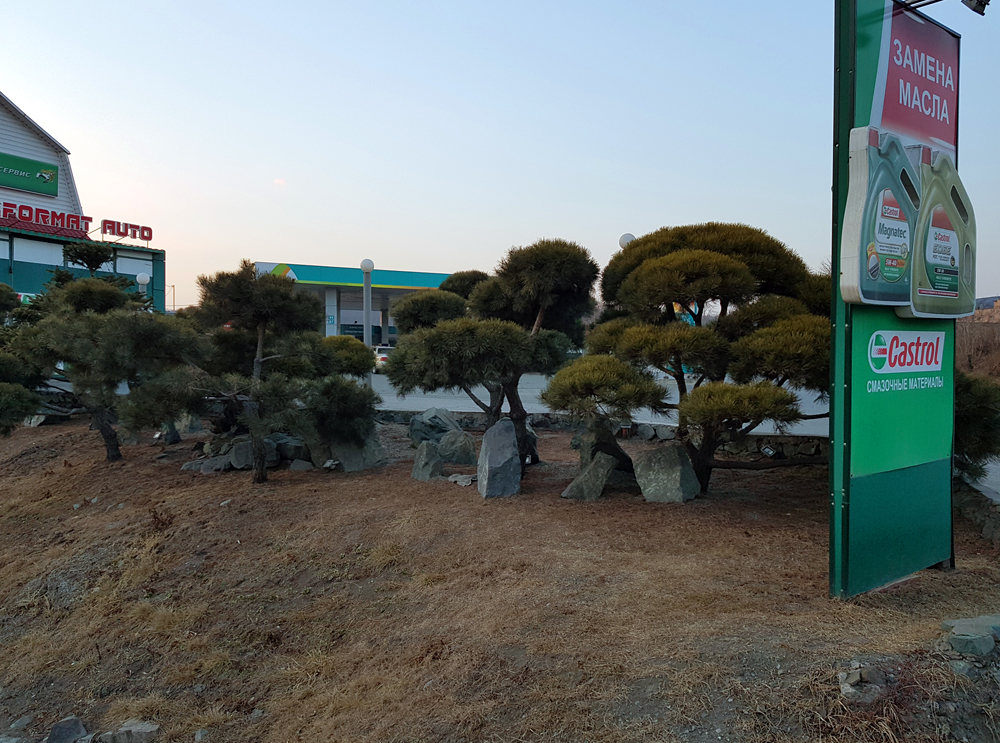 Первые мои зеленые насаждения как раз здесь – у автосервиса. Это работа с сосной густоцветковой. У меня также есть интерес к культуре бонсай, элементы которой применил здесь. Смысл бонсай – это горшочные деревья, которые нужно сформировать особым образом, чтобы они были маленькие, но смотрелись как большие деревья в природе. То есть миниатюра. А в этом случае – садовый бонсай, но цель та же самая, задать форму, а в итоге создать участок, похожий на какой-то реальный природный ландшафт. Мне очень нравятся наши места в бухте Витязь, мыс Гамова, они и вдохновили.