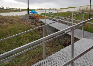 Более того, у домов № 1 и 5 сама детская площадка находится на значительном возвышении, туда ведут по две лестницы без пандусов. Таким образом доступ туда с коляской является испытанием, а для маломобильных граждан он не возможен в принципе.