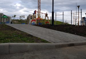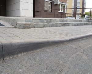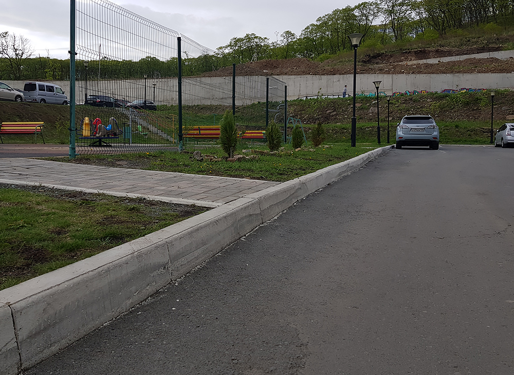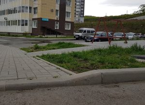 Среди первых четырех домов на улице – то есть в жилом комплексе “Восточный бриз” бордюрные плиты уменьшенной высоты застройщик применил только у входов в дома. Исключение – дом № 7, где такие плиты применены еще и у выхода на детскую площадку, у всех остальных домов чтобы попасть туда нужно преодолеть высокий бордюр.