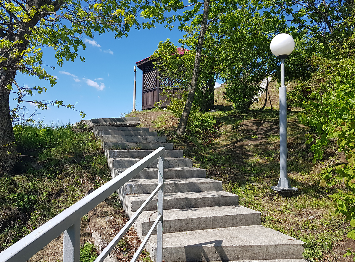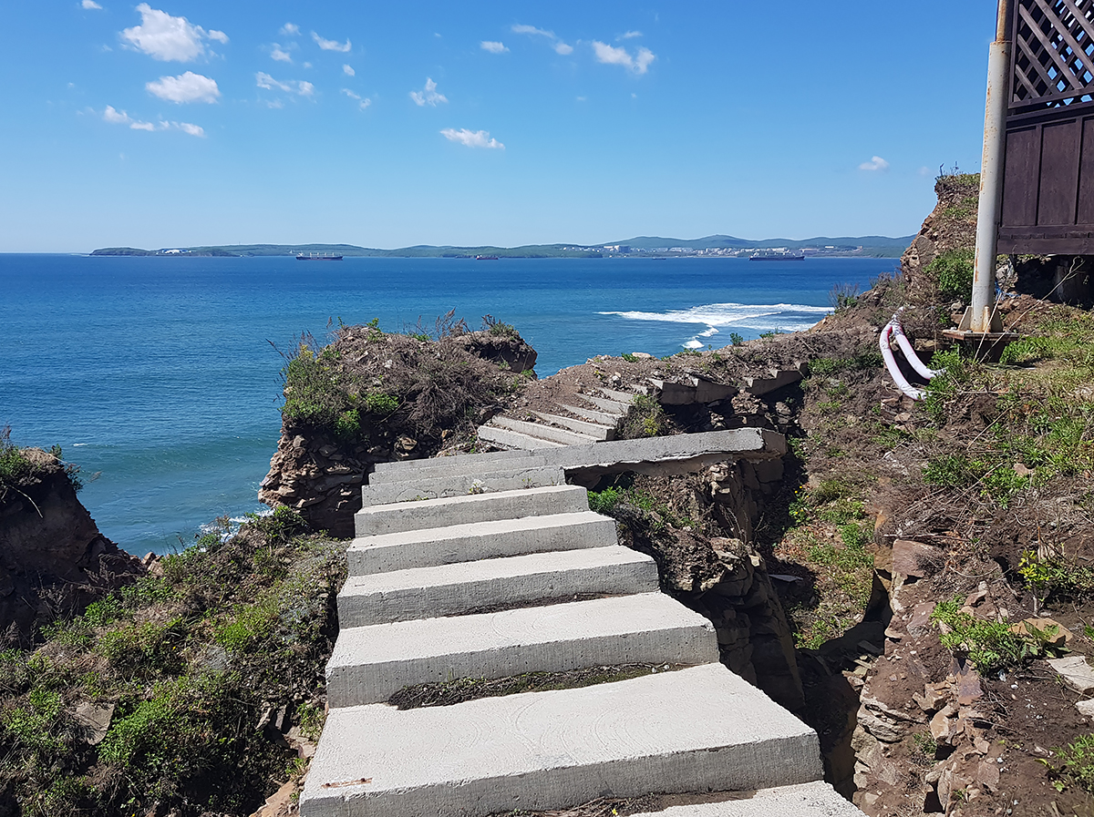 У самого “элитного” дома неподалеку тоже не успели пирс, зато построили лифт к нему. Другой отголосок ускоренной стройки перед Саммитом – обрушенная лестница, ведущая к спортивной площадке. Спасатели говорят, что скала на берегу еще в первые годы начала разрушаться, а с каждым новым штормом проблема усугубляется, стихия уже добралась до тротуара и в зоне риска может оказаться спортплощадка. Кстати, доступ туда для открыт для гражданских – нужно лишь записаться у дежурного, не нужно карабкаться через забор.
