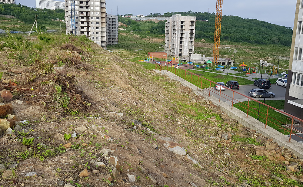 На момент сдачи дома, а также всего последующего времени застройщик не провел работы по благоустройству склонов от верхней дороги до детской площадки, до опорной стены, до площадки под мусорные баки. Таким образом, спустя три года после сдачи дома происходит значительное осыпание скалистого грунта, камни скатываются к площадкам дома, сыпятся вдоль опорной стены и представляют угрозу жизни и здоровью людей, а также транспортным средствам. Особую опасность катящиеся камни представляют в период выпадения осадков и оттаивания грунта после зимы.