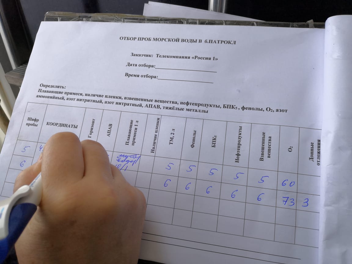 Последняя точка этого грустного морского турне — бухта Патрокл. Температура воды плюс 18. Набираем в баночки воду и дары со дна морского, они, кстати, с тем самым канализационным «запашком», и отвозим в лабораторию. Результаты узнаем через неделю.