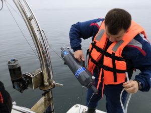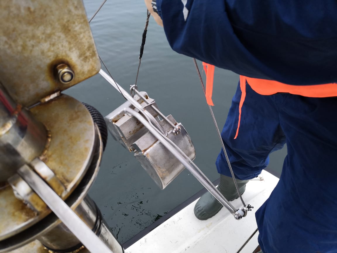 Амурский залив. 30 килограммов стали лебедкой опускают в воду. У мыса Кунгасный и в Спортивной гавани вместе с сотрудниками Центра мониторинга загрязнений окружающей среды берем пробы того, что на дне морском скопилось и, конечно же, воды. Кстати, здесь ее температура вполне комфортная для купаний — плюс 19. И это несмотря на прохладное лето.