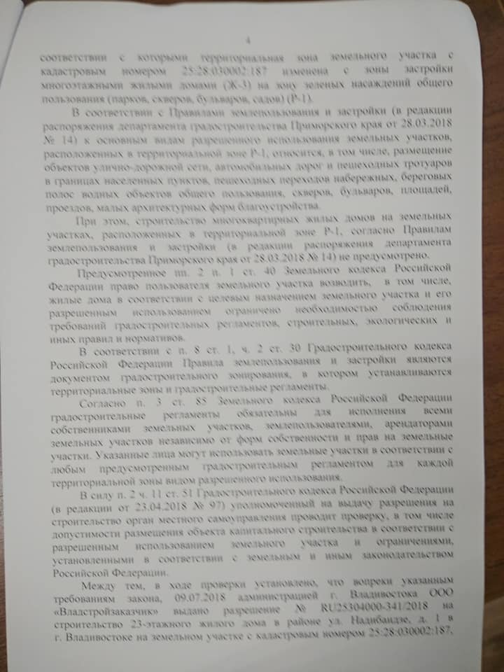 Прокуратура обязала устранить коррупциогенный фактор, наладить инвентаризацию зелёных насаждений. Также прокуратура потребовала отменить незаконное разрешение на строительство , выданное компании “Владстройзаказчик”
