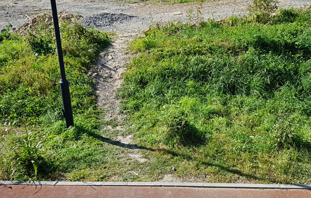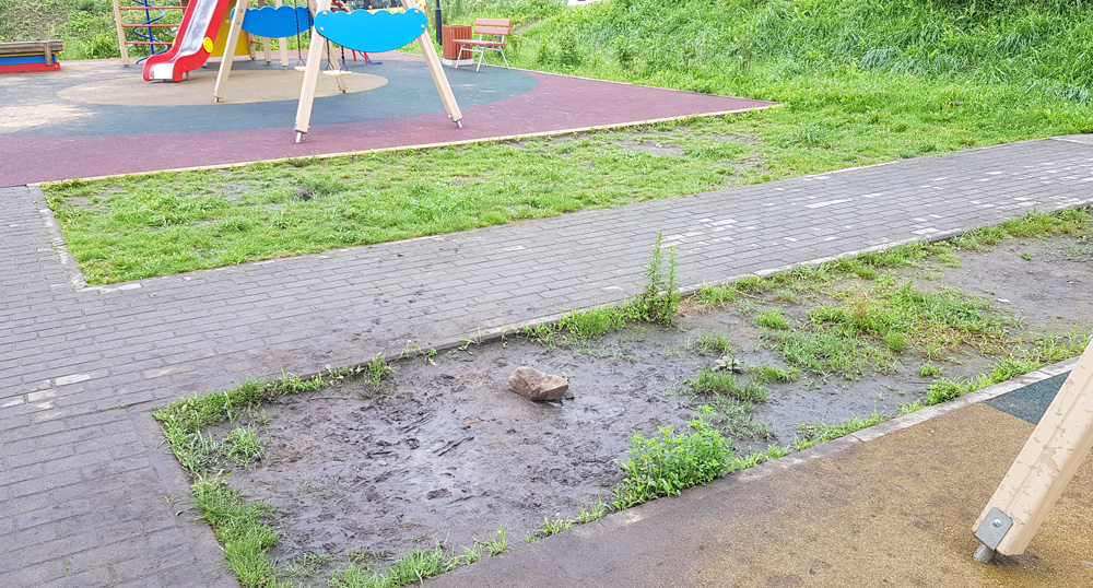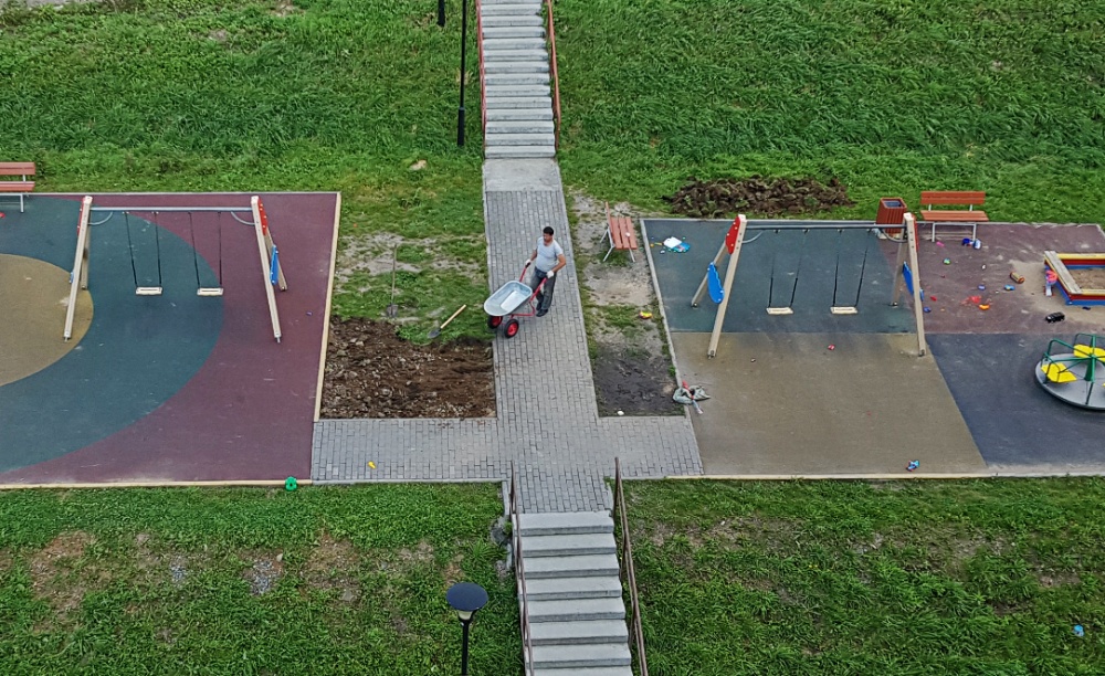 Брусчатка, которую вынули на бельевой площадке в ходе превращения её в тренажерную использована в 3 областях на детской площадке, где кусты и трава не имели шансов на выживание.