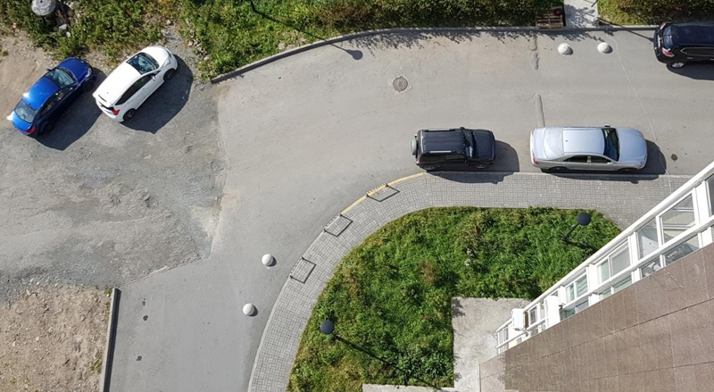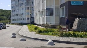 Бетонные полусферы в качестве меры против парковки в проблемных местах были выбраны после долгих сравнений и выбора вариантов решения. В отличие от столбиков они не мешают крупным автомобилям, в том числе пожарным. Данное решение мы подглядели у дома №15. Мы покрасили их в яркий желтый цвет, а благодаря флуоресцентной краске они заметны и в темноте.