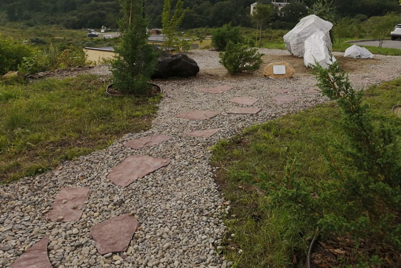 - Название нашего жилого комплекса «ВОСТОЧНЫЙ бриз» натолкнуло на идею японского сада камней и рокария. В результате появились дорожки из гальки с камнями, установлены декоративные мраморные глыбы.