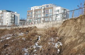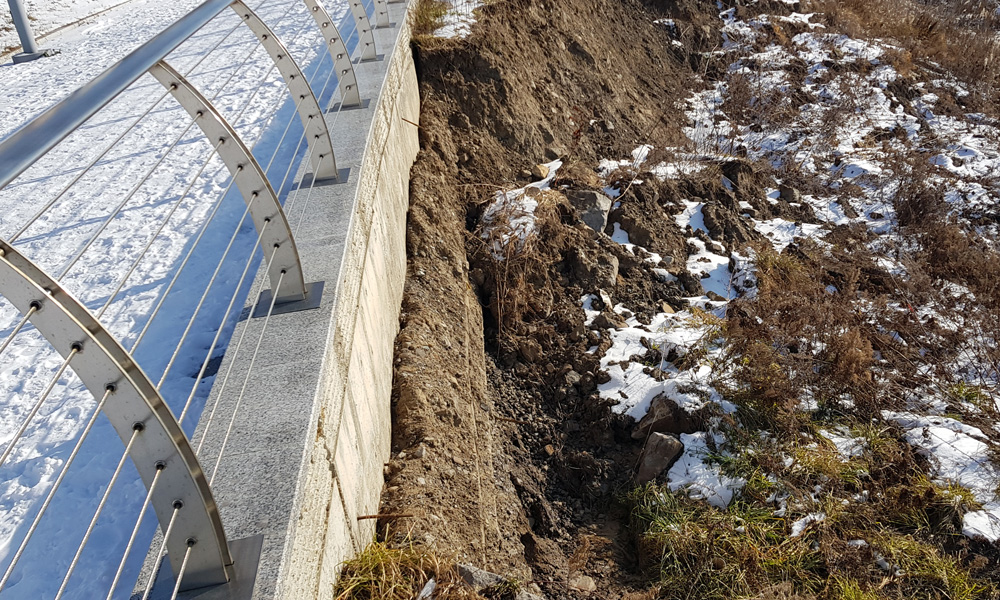 На фото видно, что грунт смыло до самого основания стены, возможно, зимой беспокоиться не о чем, но весной грунт начнет “гулять” и это место следует огородить предупреждающими лентами, ведь спешить с ремонтом этого малоприоритетного объекта мэрия вряд ли будет.